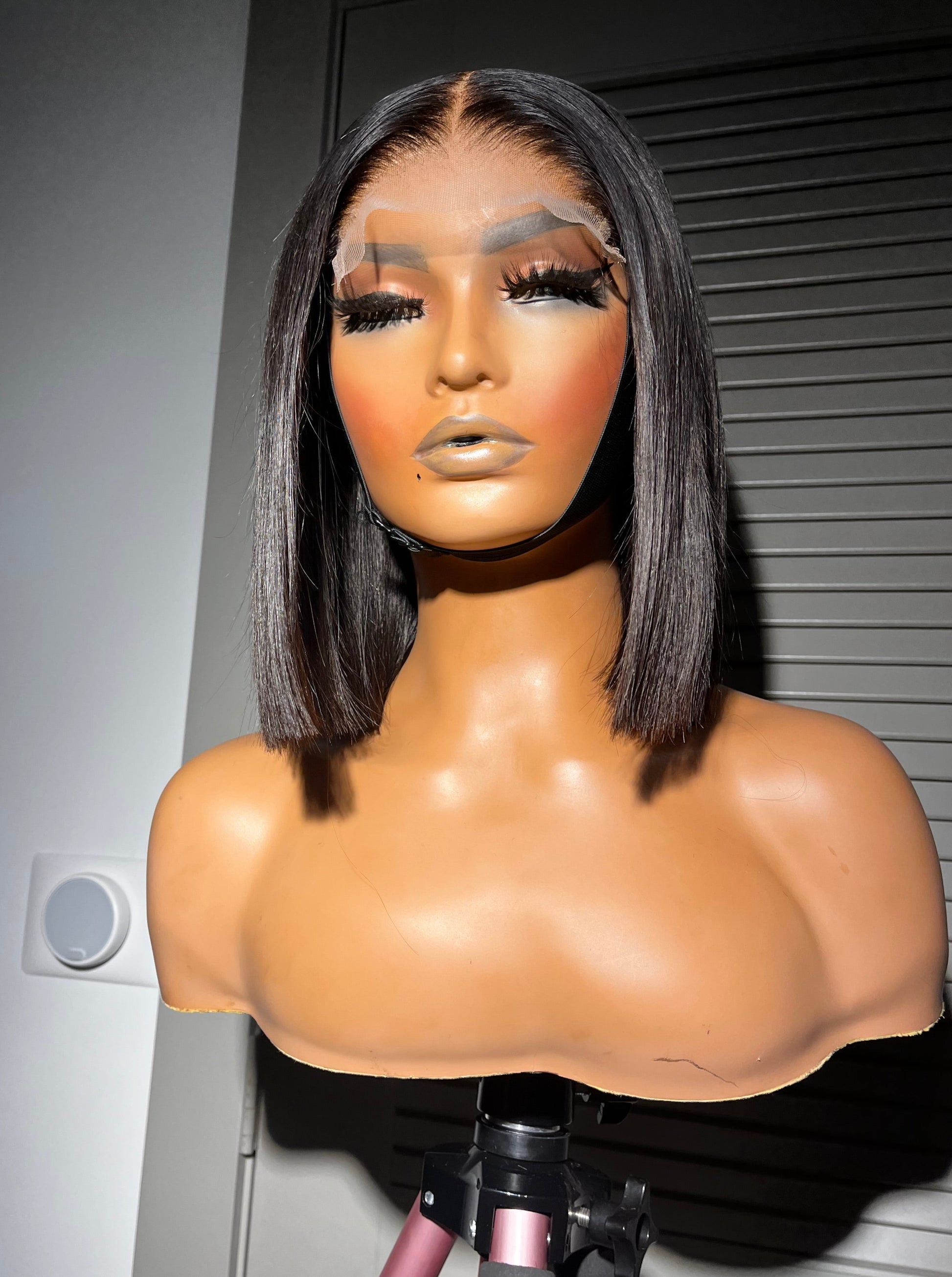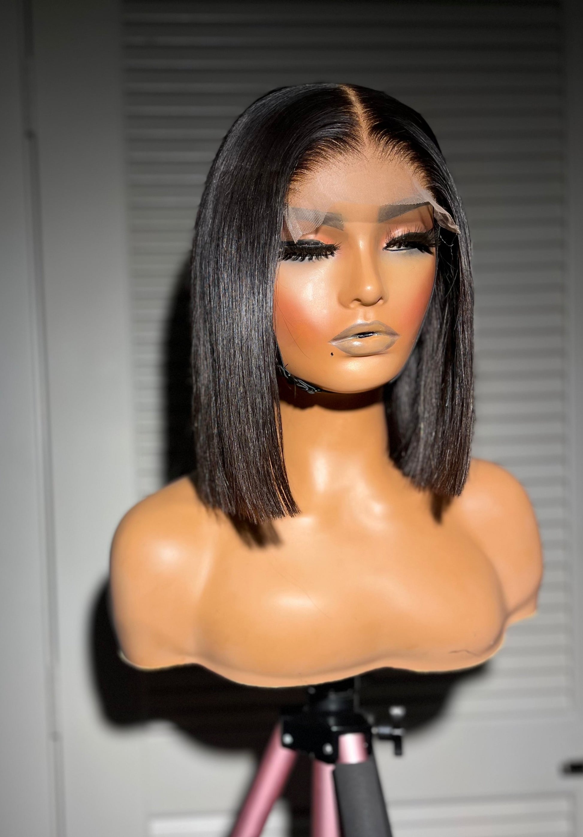 Chastity is a custom 12" 180% density wig constructed with a 4x4 Lace Closure and our Vietnamese Bundles. She will come styled bone straight w/ a bang